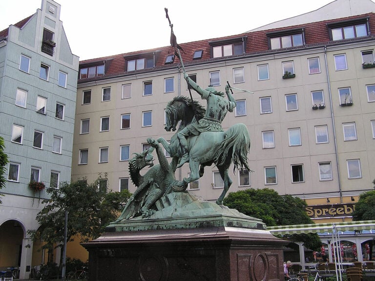 Pyhä Yrjö -aiheinen patsas Berliinissä. Kuva: Wikimedia Commons