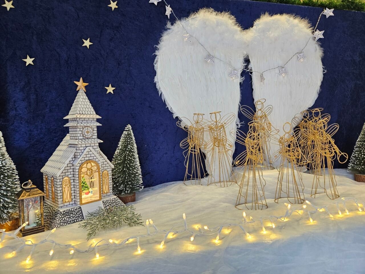 Jouluikkunasta löytyy muun muassa kirkko enkelihahmoja.