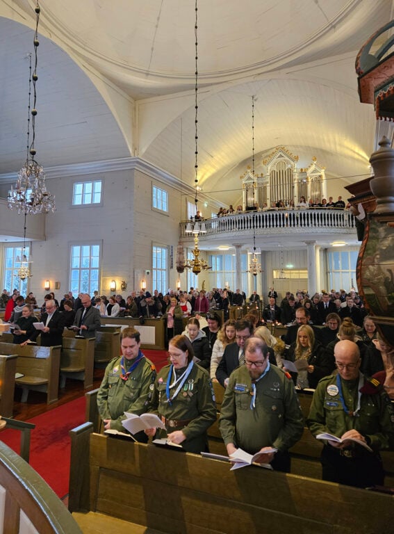 Tukea Mertaniemelle riitti juhlapäivänä, sillä kirkkoon kokoontuneen väen joukossa oli paljon ihmisiä hänen elämänsä varrelta.