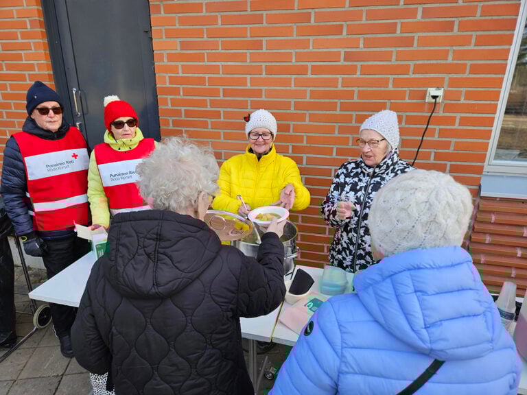 Toimitalon seinustalla leijailee hyvä tuoksu: Suomen Punaisen Ristin Rantalakeuden osaston vapaaehtoiset tarjoilevat valmistamaansa keittoa.