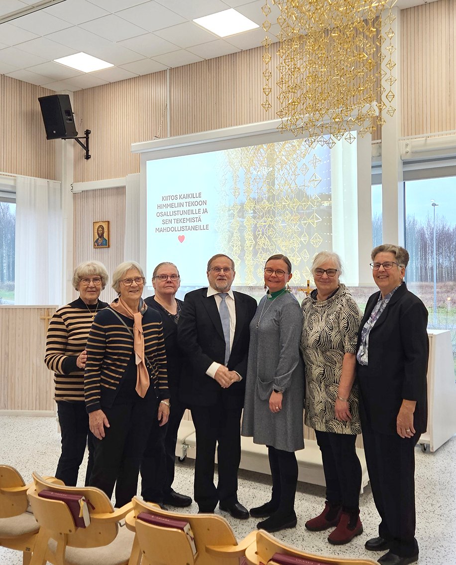Kuvassa vasemmalta lähtien mukana tapahtumassa olleita himmelin rakentajia: Senja Lamberg, Sisko Hakalin, Tuula Oikarinen, Kari Kisko (opettaja), Pirita Satomaa (diakoni), Terttu Kukkula ja Virve Pulkkinen.