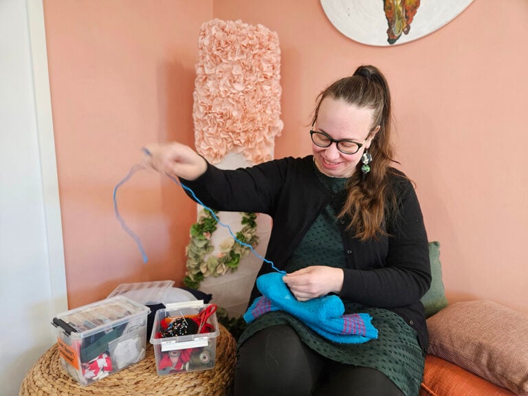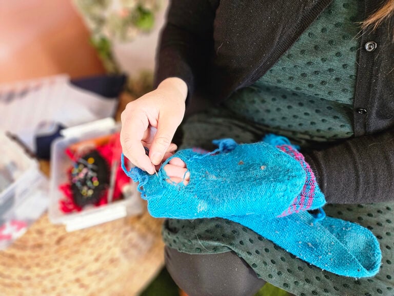 Korjauskerhossa jaetaan yhdessä korjaustaitoja. Aino Häli on perehtynyt kerhossa erilaisiin parsimistekniikoihin.