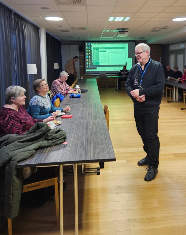 Vapaaehtoisten kirkonvartijoiden ryhmä lähti liikkeelle seurakuntamestari Heikki Törmäsen aloitteesta. Ryhmää luotsaava Törmänen ehtii vaihtaa kuulumisia ennen kokouksen alkua.