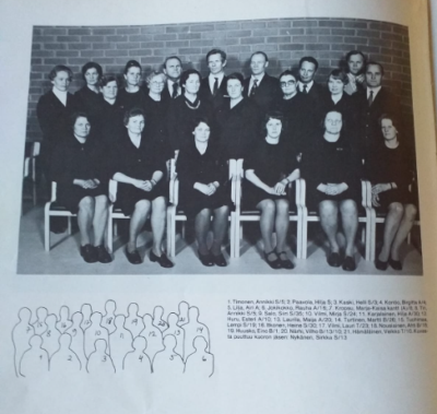 Kiimingin kirkkokuoro vuonna 1977. Tuolloin kuoronjohtajana toimi Marja-Kaisa Kropsu. Birgitta Kontio alarivissä kolmas oikealta.
