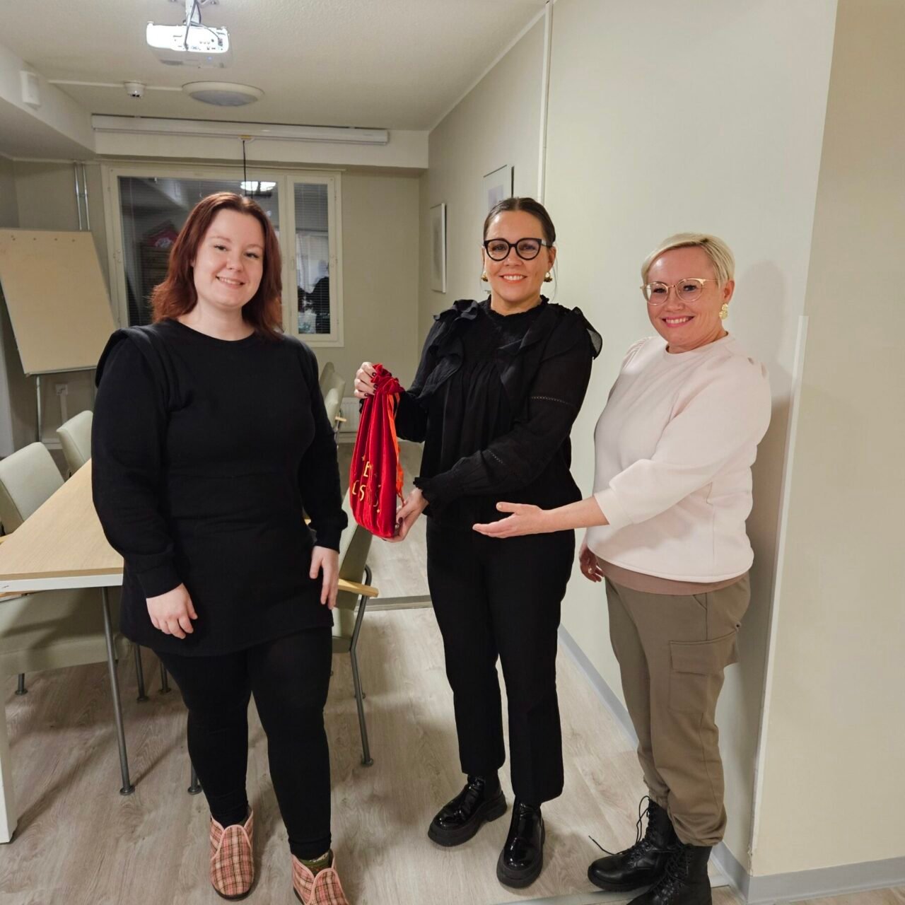 Oulun ensi- ja turvakoti ry:n viestintäassistentti Essi Puuri vastaanotti Lähellä-kuoron lahjoituksen. Kuorosta paikalla olivat Heidi Mäki-Leppilampi ja Heli Tuikka.