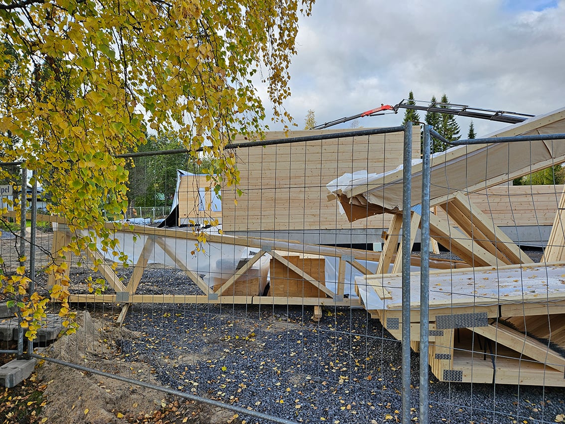 – Runko on nyt pystyssä. Parhaillaan tehdään yläpohjan vesikatteita ja vesikattovaihe saadaan valmiiksi tällä viikolla. Varsinainen pintahuopa ja konesaumattu pelti asennetaan alushuovan päälle vasta keväällä, kertoo projektipäällikkö ja rakennustyön valvoja Aaro Kemppainen Welado Oy:stä.