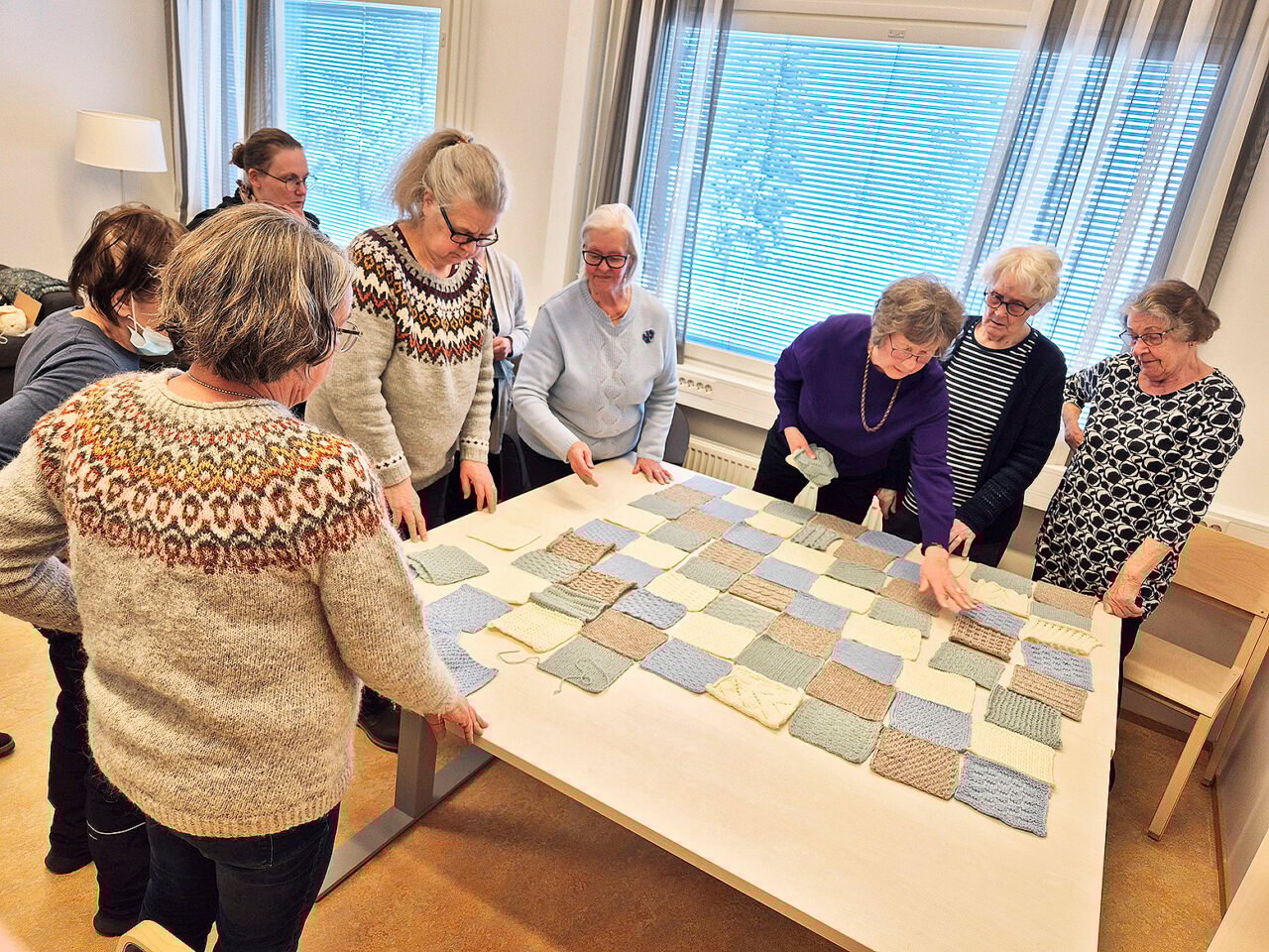 Oulunsalon seurakunnan neulontaryhmä ilahtuu aseteltuaan työnsä tulokset pöydälle. Neliönmuotoisia ruutuja on tehty niin paljon, että niistä saadaan yhdistämällä torkkupeitto.