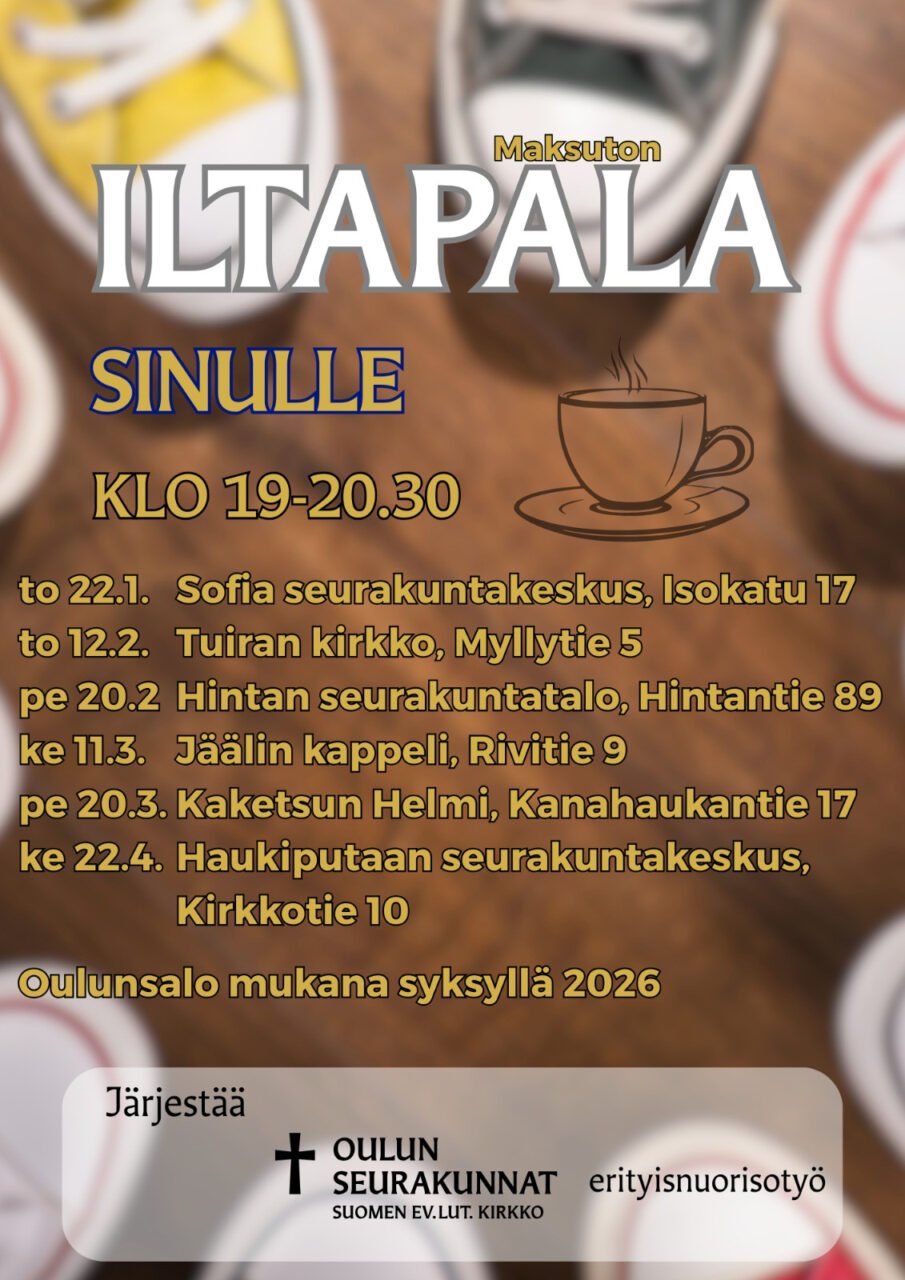Seurakuntien diakoniatyön aamupalat ja lounaat ovat tulleet viime vuosina monille tutuiksi, mutta nyt Oulun seurakuntien erityisnuorisotyö ryhtyy tarjoamaan maksuttomia iltapaloja eri puolilla Oulua.