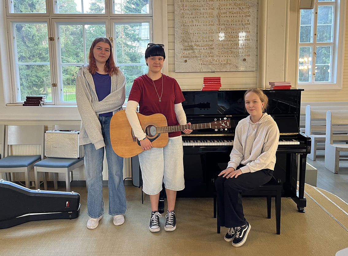 Venla Tuisku ja Sonja Hälinen valmistautuivat syyskuun nuorten iltamessuun yhdessä vs. nuorisotyönohjaaja Emilia Partasen kanssa.