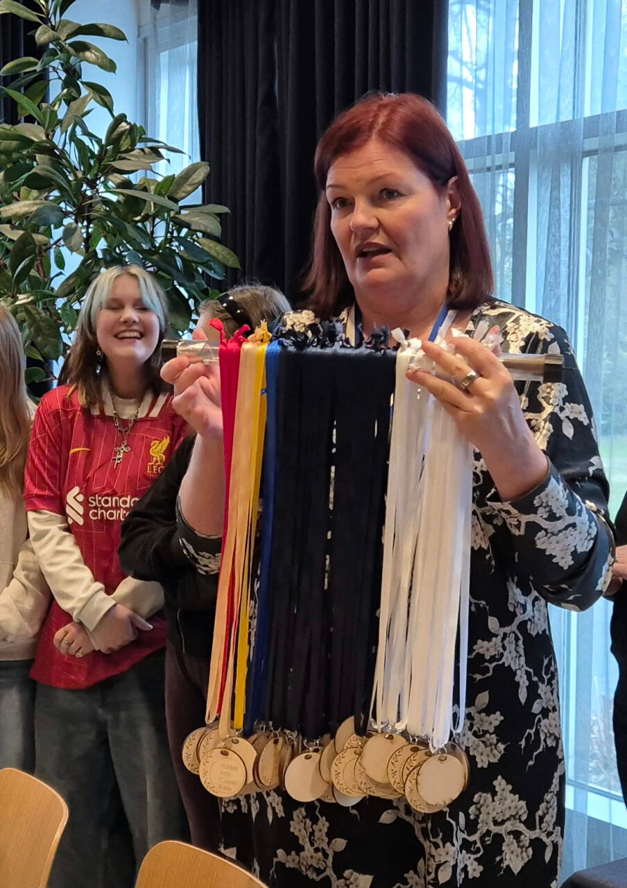 Soittokunnan toiminnanohjaaja Pauliina Sormunen esittelee orkesterien suomenmestaruuskisojen mitalisaalista.