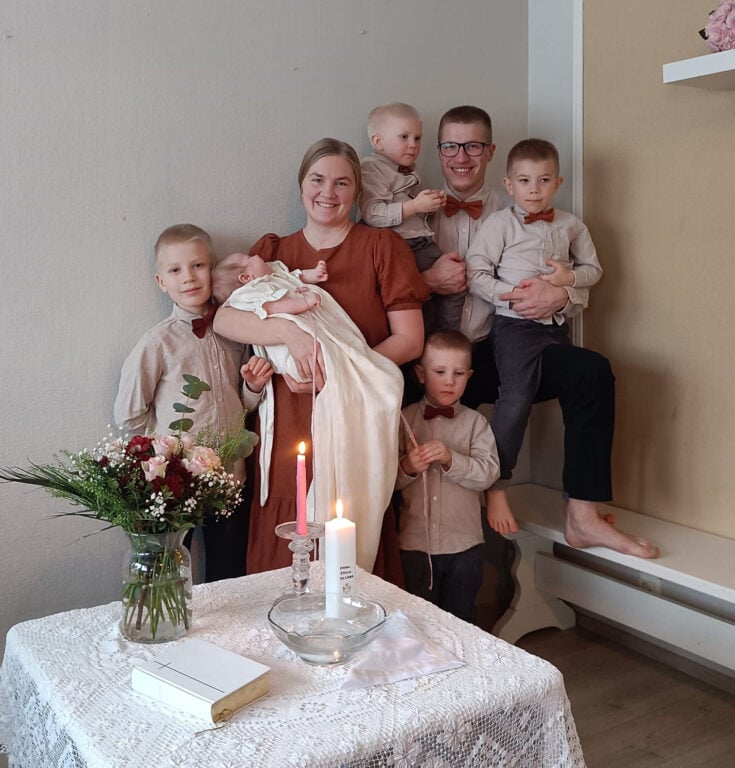 Perhepotretti kastepäivänä: juhlan päähenkilö Aada Emilia lepää Anniina-äidin käsivarsilla, Hans-isän sylissä Allan ja Leevi. Äidin vasemmalla Nooa, oikealla puolella Joosua.