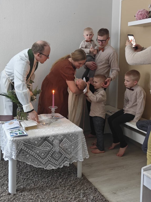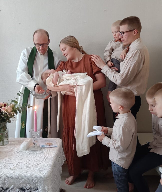 Turpeisen perheen kuopus kastettiin kotona. ”Minä kastan sinut Isän ja Pojan ja Pyhän Hengen nimeen”, lausuu kastepappi Teemu Riihimäki.