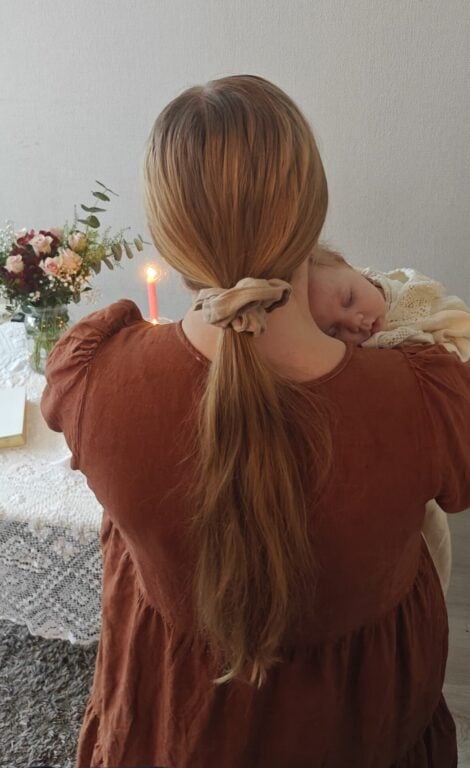– Hansin 30-vuotissyntymäpäivälahja, Anniina Turpeinen hymyilee vauva sylissään.