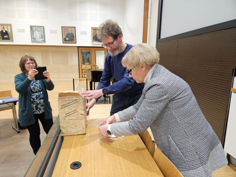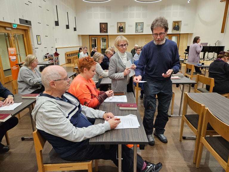 Jarmo Komulainen ja Hannele Kurkela laskemassa puheenjohtajaäänestyksen tulosta, Rauhan Tervehdyksen toimittaja Minna Kolistaja kuvaa.