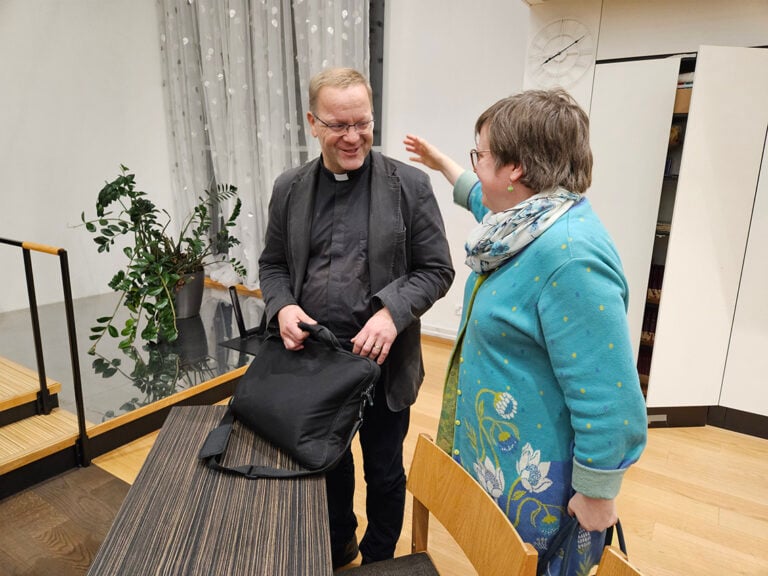 Rauhan Tervehdys ry:n hallituksen jäsen Sirpa Laurila kävi tervehtimässä puheenjohtaja Olli Lohea kokouksen päätteeksi.