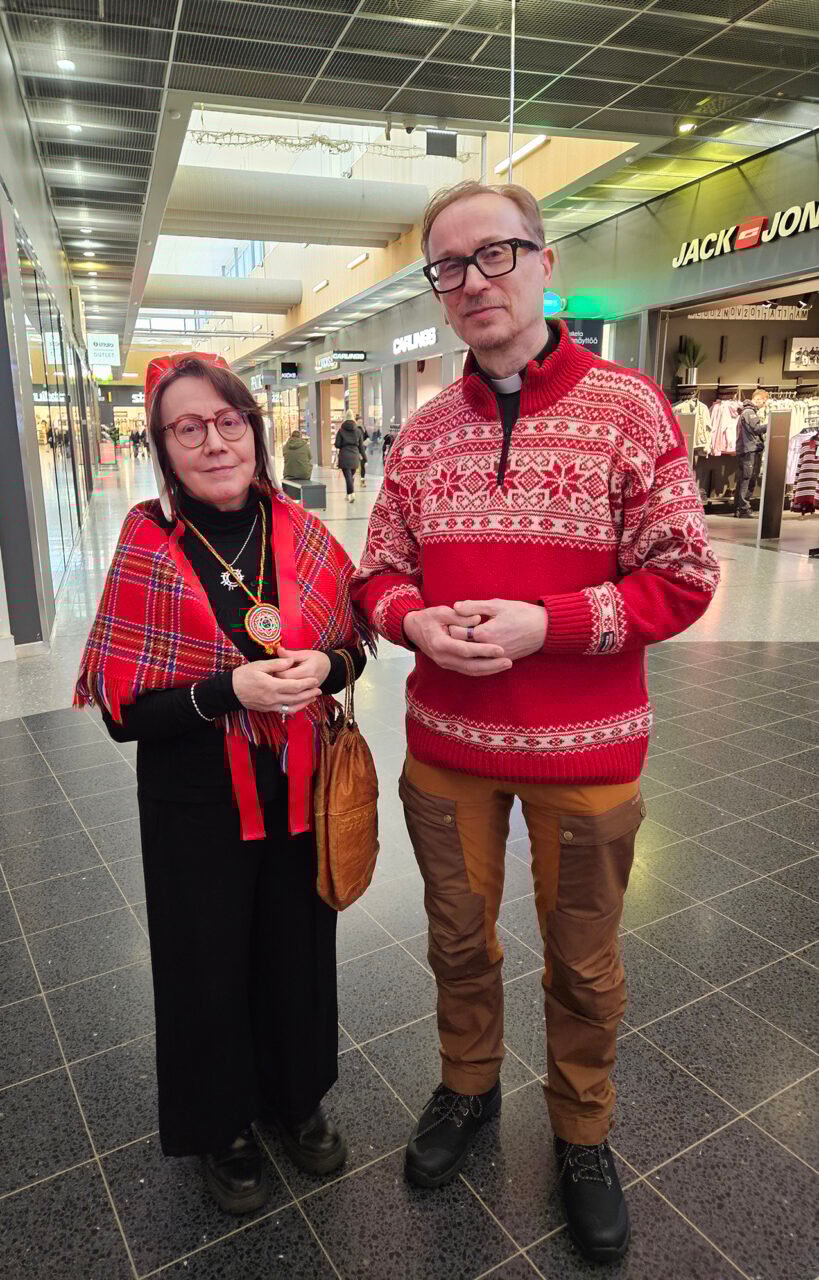 Saamelaiskerho lähti liikkeelle Rita Magga-Kumpulaisen ideasta. Kerhossa on mukana pastori Juha Maalismaa, joka on työskennellyt saamelaispastorina Inarissa ja opiskellut aktiivisesti saamenkieliä. Kaksikko kuvattiin ostoskeskus Zeppelinissä.