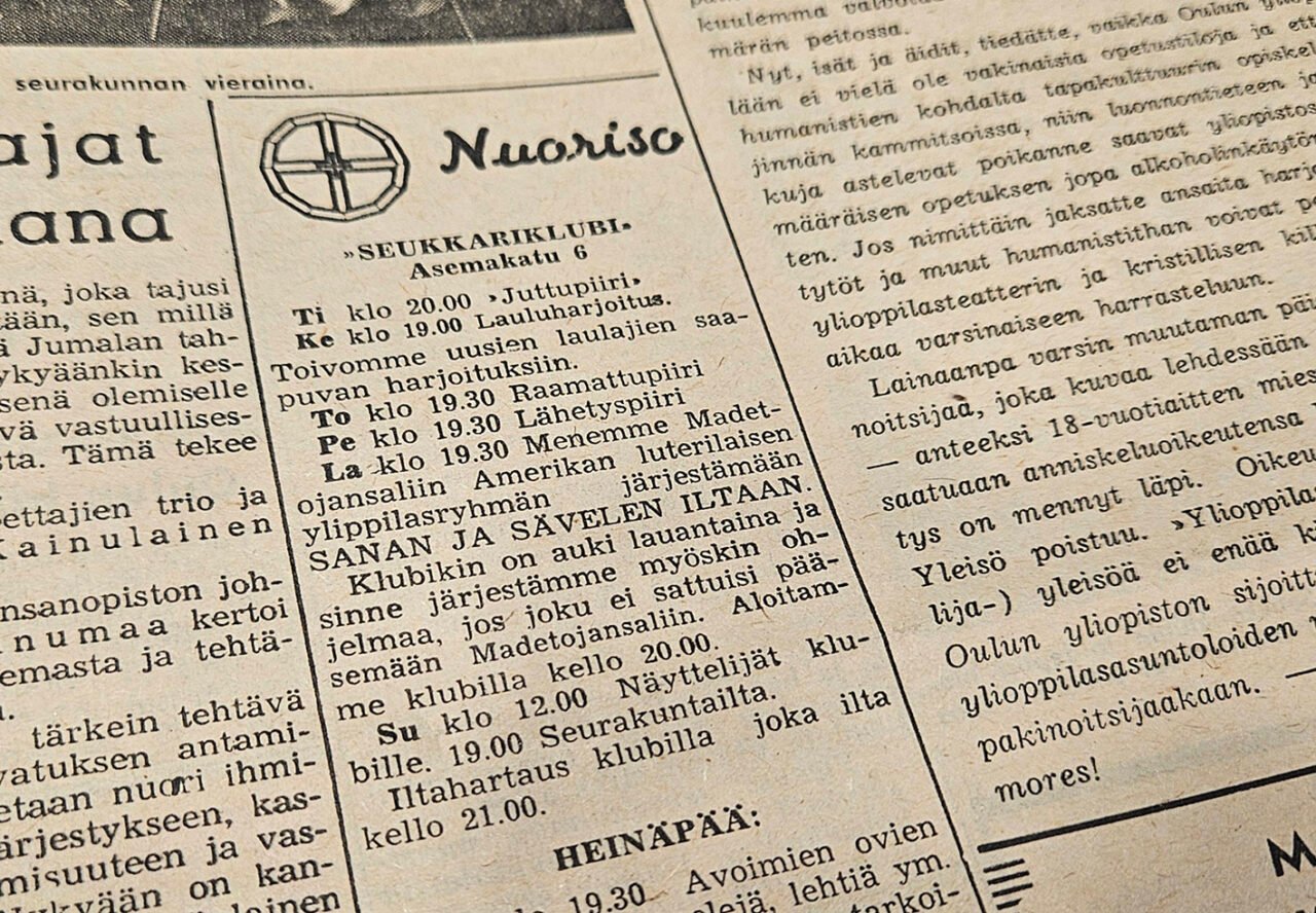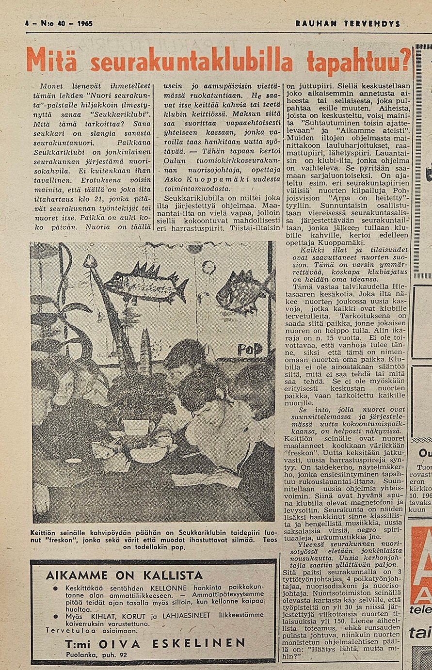 Seurakunnan nuorisotoimisto sijaitsi Asemakatu 6:ssa syksystä 1965 alkaen. Seukkariklubin ilmoitus löytyi samana syksynä jokaisesta kotiin kannetusta Rauhan Tervehdyksestä.