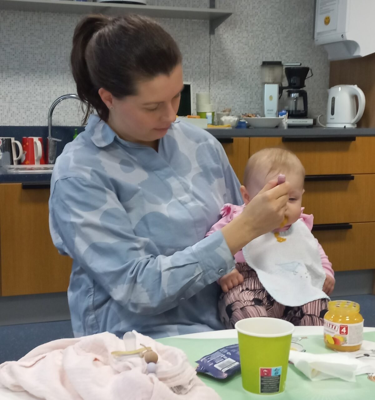 – Lapsi selvästi nauttii erilaisista virikkeistä ja muiden vauvojen seurasta. Itselleni vertaistuki on todella tärkeää: olemme jutelleet täällä esimerkiksi vauvojen unirytmistä ja siitä, mitkä ruoat ovat missäkin perheessä tämän hetken hittejä.