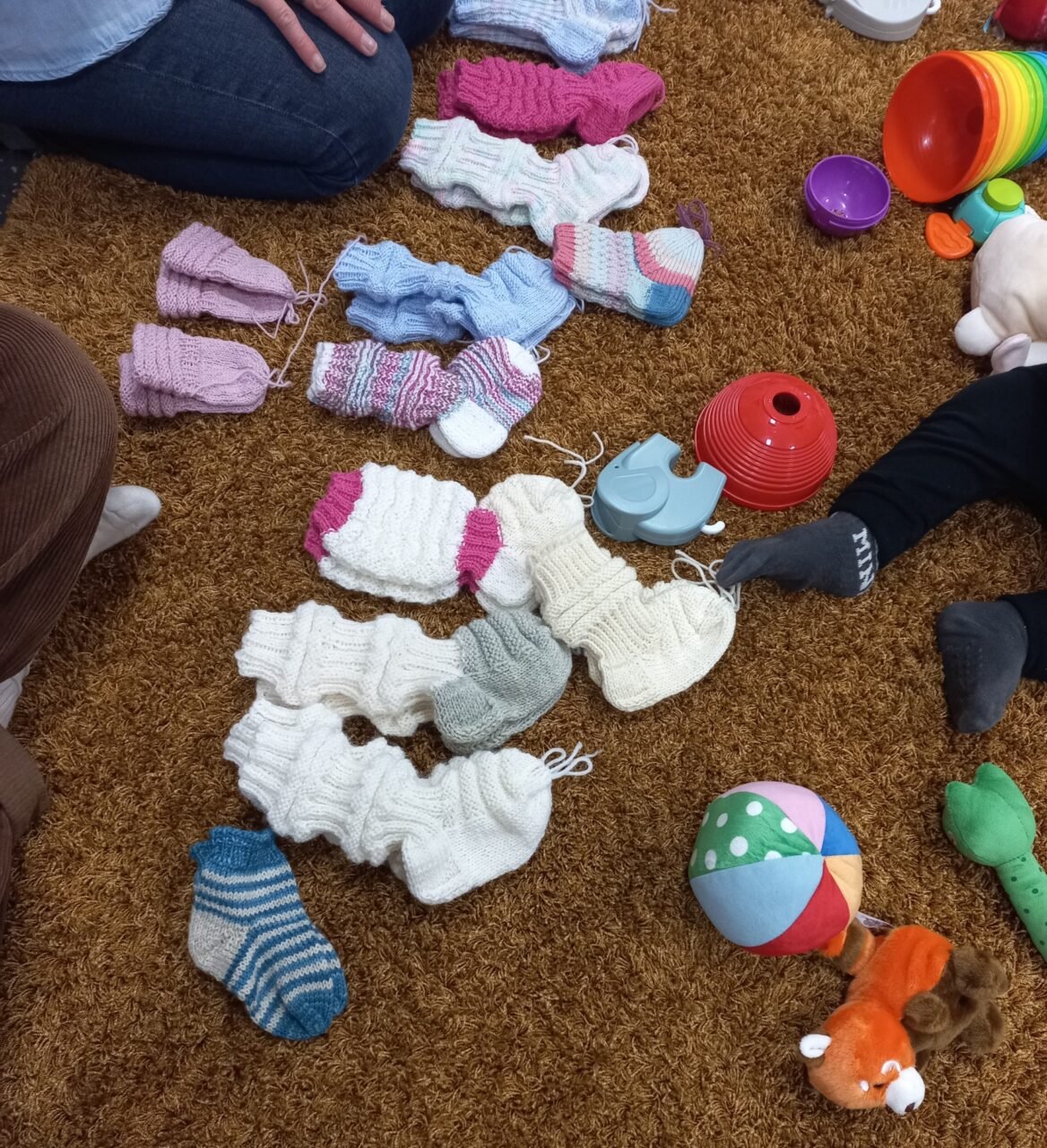 Lastenohjaaja Tea Hieta asettelee lelujen sekaan tuomiorovasti Satu Saarisen paikalle toimittamia, vapaaehtoisten kutomia villasukkia ja lapasia, joista äidit saavat valita lapselleen mieluisat villaiset mukaansa.