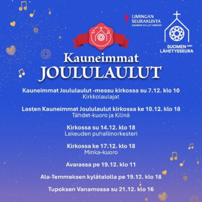 Kauneimmat joululaulut -messu su 7.12. klo 10 kirkossa. Toimittaa Eeva Mertaniemi, avustaa Marjo Aalto, musiikissa Mika Kotkaranta ja Kirkkolaulajat.