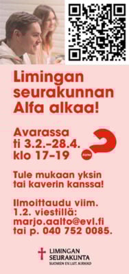 Walk in -terapia ma 2.2. ja 9.2. Avarassa. Matalan kynnyksen keskusteluapua alle 30-vuotiaille ajanvarauksella. Aikoja varattavana klo 15–16 ja klo 16–17. Terapeutteina toimivat koulutetut henkilöt. Lisätietoa ja ajanvarauslinkki osoitteessa liminganseurakunta.fi/apua-ja-tukea.