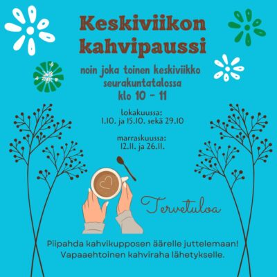 Keskiviikon kahvipaussi ke 15.10. klo 10–11 srk-talolla. Kaikille avoin kahvihetki. Nähdään ja jutellaan. Poikkea kahville! Vapaaehtoinen kahviraha lähetykselle.