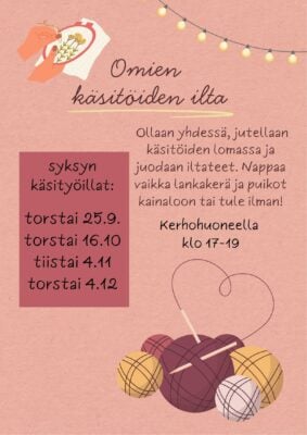 Omien käsitöiden ilta to 16.10. klo 17–19 kerhohuoneella Ylipääntie 11. Tule käsityön kanssa tai ilman. Ollaan hetki yhdessä jutellen ja käsitöitä tehden, iltatee.