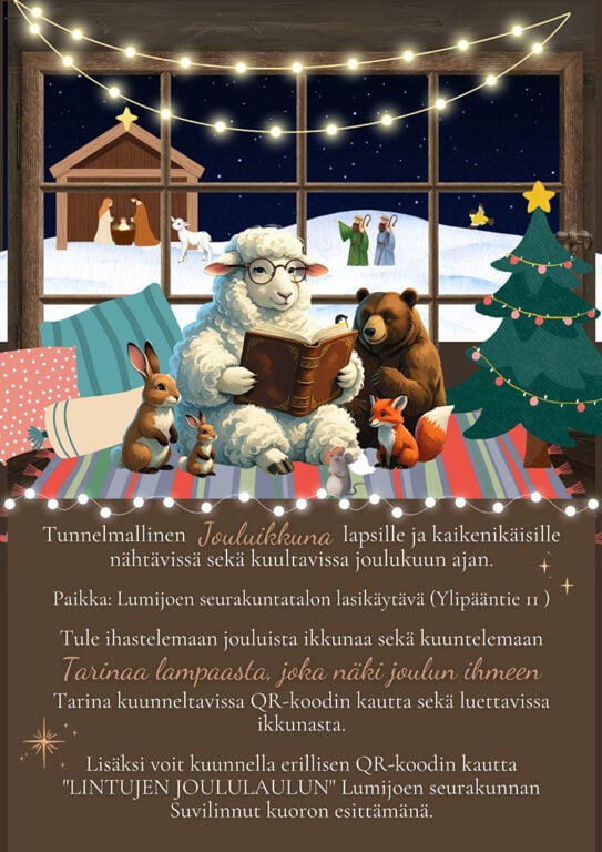 Tunnelmallinen Jouluikkuna – ”Lammas, joka näki joulun ihmeen” - lapsille ja kaikenikäisille, nähtävissä ja kuultavissa joulukuun ajan srk-talon lasikäytävässä, Ylipääntie 11. Katsottavissa ulkoa, tarina ja laulu löytyy tekstinä ja QR-koodin kautta.