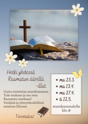 Hetki yhdessä Raamatun äärellä ma 13.4. klo 18–20 srk-talolla. Uutta toimintaa seurakunnassa. Tervetuloa mukaan ja ota ota oma Raamattu matkaan! Vetäjinä Siitoset. Seuraavat kokooontumiset ma 27.4. ja ti 12.5.