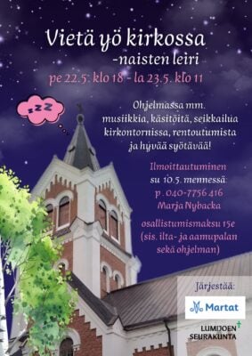 Vietä yö kirkossa – naisten leiri pe 22.5.klo 18 – la 23.5. klo 11 Lumijoen kirkko. Yli 15-vuotiaille. Ohjelmassa mm. musiikkia, käsitöitä, seikkailua kirkontornissa, rentoutumista ja hyvää syötävää. Ilmoittautuminen ti 12.5. mennessä: p. 040 7756 416 / Marja Nybacka. Osallistumismaksu 15 €. Järjestää Martat ja seurakunta.