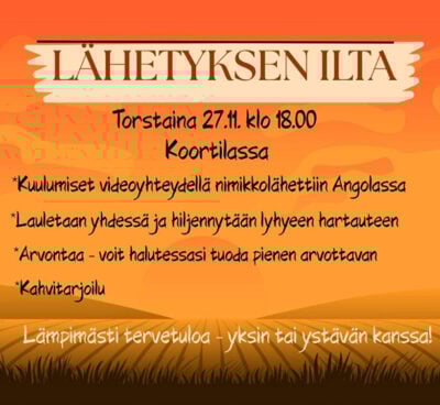 Lähetysilta: videotervehdys Angolasta to 27.11. klo 18 Koortila. Ks. ilmoitus.