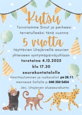 5-vuotiaiden syntymäpäivät to 4.12. klo 17.30 kerhotila. Tänä vuonna 5 vuotta täyttävien utajärveläisten ilm. ja ruokavaliot pe 28.11. mennessä Sallalle p. 040 350 5454.