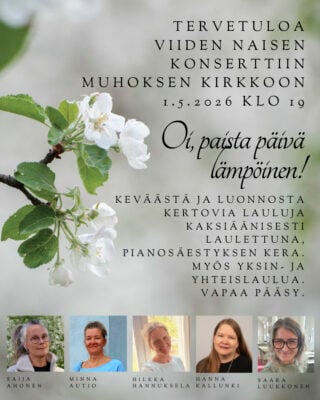 Messu su 26.4. klo 10 kirkko.Eva-Maria Mustonen, Pia-Mari Kuure, Ossi Kajava.
