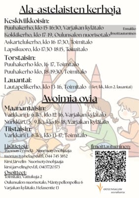 Oulunsalon seurakunnan lapsikuoro keskiviikkoisin klo 17.30–18.15. Tervetuloa entiset ja uudet laulajat mukaan! Ei koelaulua.