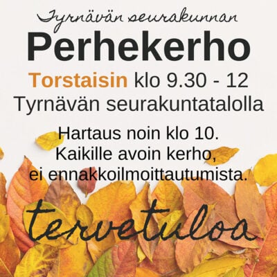 Perhekerho to 9.10., 16.10. ja 23.10. klo 9.30–12 Tyrnävän srk-talolla. Kaikille avoin kerho. Ei ennakkoilmoittautumisia.