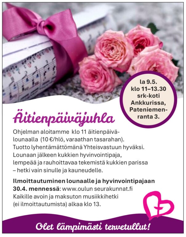 Ilm. 9.4.–12.5. www.oulunseurakunnat.fi. Lisätietoja Virpi Huttunen, p. 040 500 3263, Viivi Jokela, p. 050 513 3225.