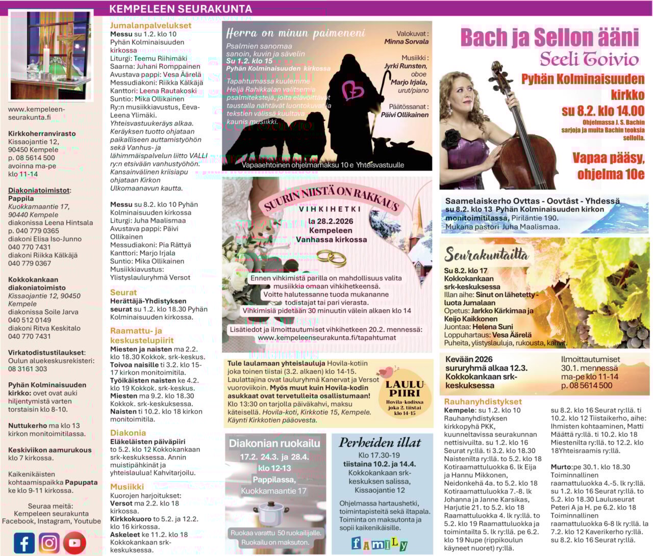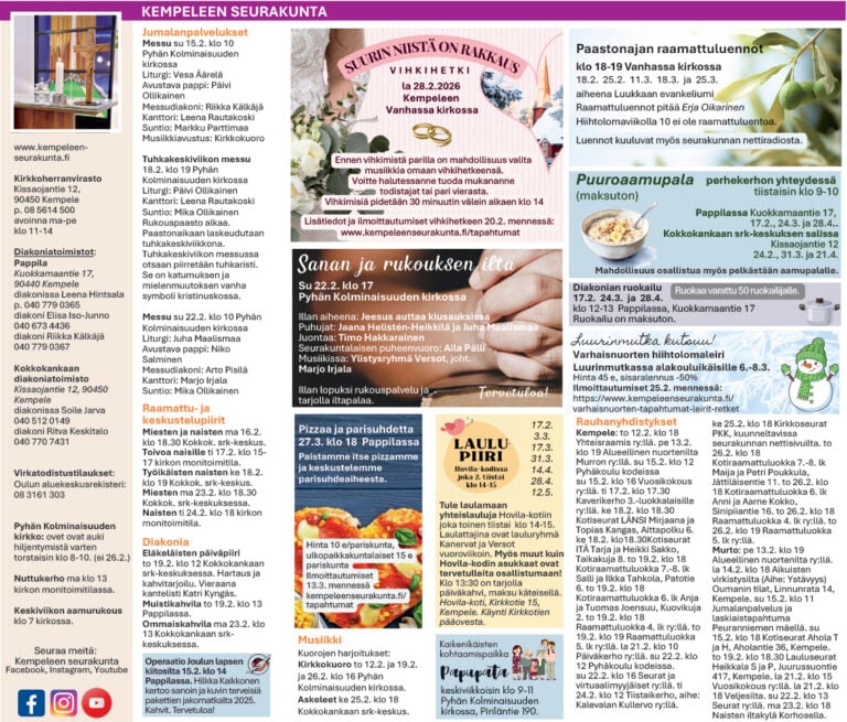 Rauhanyhdistyksen toimintaa: Haukipudas: vuosikokous su 15.2. klo 15 ry:llä. Seurat su 22.2. klo 14 palvelukoti Kultasimpussa, seurat su 22.2. klo 17 kirkossa. Kello: yhteinen seurakuntapäivä su 8.2. klo 13 Jokikylän ry:llä.