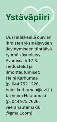 SPR:n ja seurakunnan ystäväpalvelu etsii uusia ystäviä! Tiedätkö sellaisen ihmisen, joka kokee yksinäisyyttä tai tarvitsee kaveria esimerkiksi ulkoiluun? Oletko ehkä itse tällaisen ystävän tarpeessa? Ilmoita ystävän tarpeesta Airille, p. 040 721 7051.