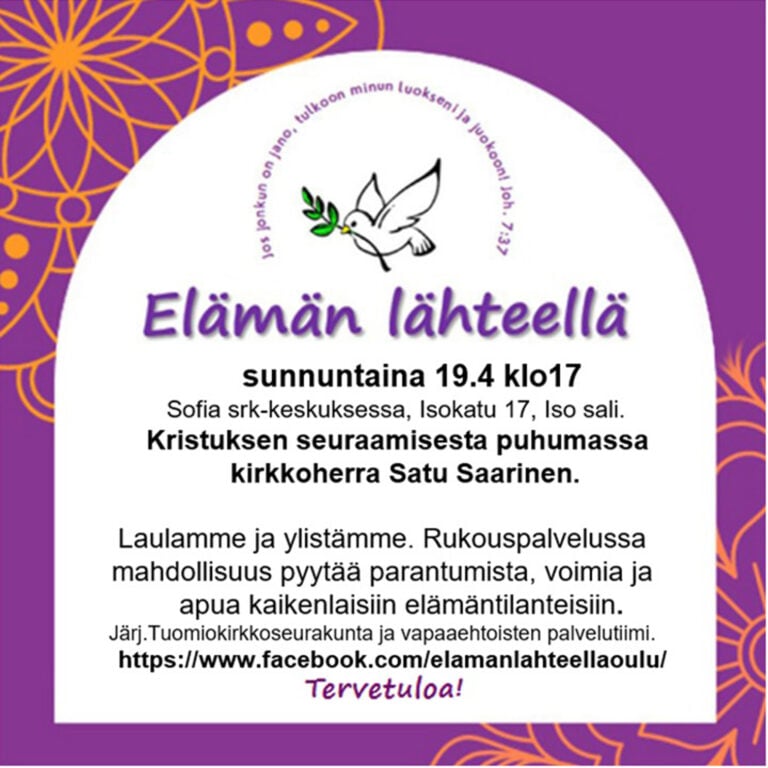Tsemppiä sanasta -ilta su 29.3. klo 17 Tyrnävän srk-talo. Tervetuloa mukaan sanan kuuloon ja laulamaan yhteislauluja Tsemppi-iltaan. Alustuksen aiheesta, ”Näin sanoo Herra”, pitää Pekka Siitonen ja yhteislauluja viisikielisestä säestää Maarit Siitonen. Todistuspuheenvuoron käyttää Erkki Haverinen. Illan aikana on mahdollisuus keskusteluun ja kysymyksiin ja tuttuun tapaan rukoilemme jätettyjen esirukouspyyntöjen puolesta.