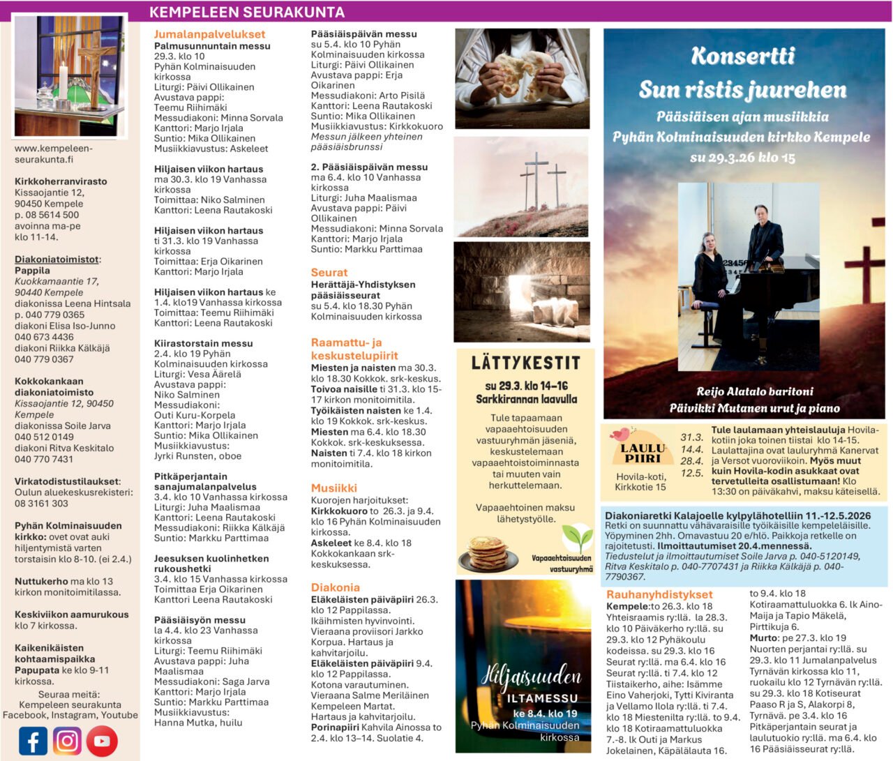 Rauhanyhdistyksen toimintaa: Haukipudas: seurat su 29.3. klo 17 kirkossa. Kello: pitkäperjantain lauluseurat pe 3.4. klo 18 Kellon srk-kodilla.