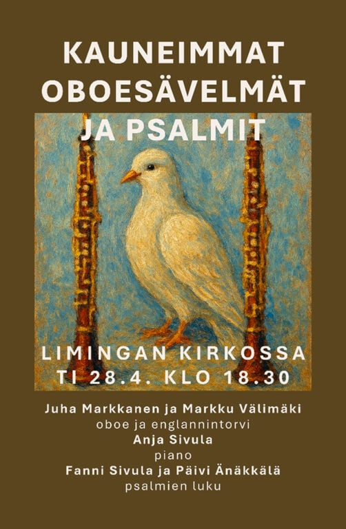 Pääsiäis- ja kevätlaulutilaisuus su 12.4. klo 16 Hailuodon kirkossa. Yhteislauluja, yksinlauluja ja duettoja. Mukana sopraano Marja Kukkala, pianisti-urkuri Miikka Lehtoaho, kanttori Tiina Saukkoriipi-Haapala. Vapaa pääsy, kolehti musiikkityölle.