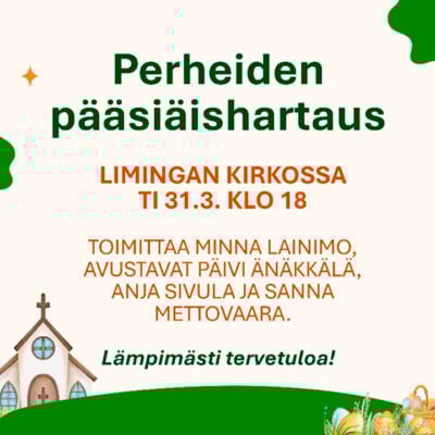 Tule kuulemaan ja katsomaan se perheiden pääsiäiskirkkoon. Kirkkohetkeen ovat kaikki tervetulleita.