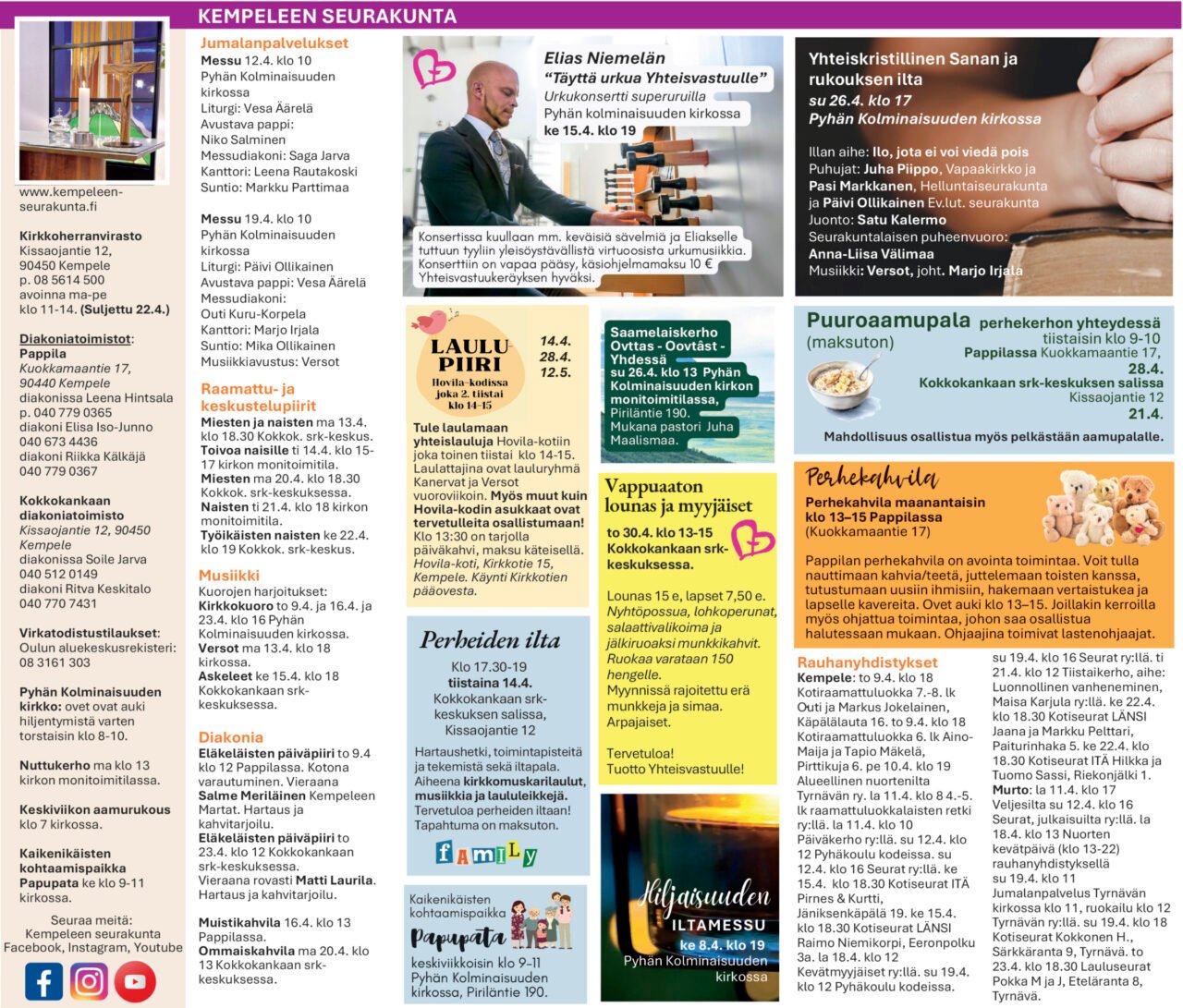 Seurakuntakerho. Ti 14.4. ei seurakuntakerhoa. Ke 15.4. klo 12 seurakuntakerhon vierailu Rauhanyhdistyksellä Ry:n keskiviikkokerhossa, johon saapuu asiantuntija Tiina-Maija Leinonen Kuuloliitosta ”Mistä apua, kun kuulo heikkenee”. Ti 21.4. kokoontuminen normaalisti srk-talolla klo 12.30–14.