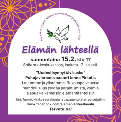 Rauhanyhdistykset: Tyrnävä: Raamattuluokat pe 13.2. klo 18.30 ry ja pe 20.2. klo 18.30 ry. Ystävänpäivämyyjäiset la 14.2. klo 16 ry. Kirkkopyhä ja kahvit su 15.2. klo 11 ry. Hartaus su 22.2. klo 14.30 Lepola. Vuosikokous su 22.2. klo 16 ry. Murto: Alueellinen nuortenilta pe 13.2. klo 19 ry. Kotiseurat su 15.2. klo 18 Aholantie 36, Kempele. Lauluseurat to 19.2. klo 18.30 Juurussuontie 417, Kempele. Vuosikokous la 21.2. klo 15 ry. Seurat su 22.2. klo 13 ry.