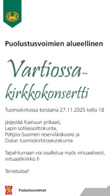 Haukiputaan kuorojen Isänmaallinen joulukonsertti ti 2.12. klo 19 Haukiputaan srk-keskuksessa. Haukiputaan Kirkon Kamarikuoro, Haukiputaan Mieskuoro, HTN:n mus.teatteri Musteria, nuorisokuoro Loiste ja Selia Ensemble. Liput 10 €, alle 18 v. 5 €, 45 min. ennen konserttia ovelta (käteis-, kortti- ja MobilePay-maksu).