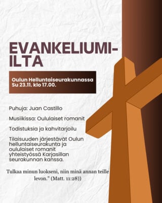 Rauhanyhdistyksen toimintaa: Tyrnävän rauhanyhdistys: Raamattuluokat pe 21.11. ja 28.11. klo 18.30 Ry. Hartaus su 23.11. klo 14.30. Seurat su 23.11. klo 16 ry. Joulumyyjäiset la 29.11. klo 12 ry. Seurat su 30.11. klo 13 ry. Murron rauhanyhdistys: Seurat su 23.11. klo 16 ry. Joulumyyjäiset la 29.11. klo 16 ry. Seurakuntapäivä su 30.11. klo 13 ry.