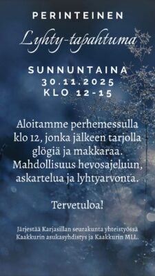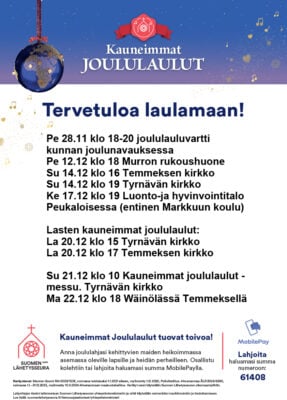 Mikäli sinulla ja perheelläsi on taloudellisia haasteita, voit hakea jouluavustusta seurakunnan diakoniatyöltä. Vapaamuotoisten hakemusten, joista ilmenee perheen koko, tulot, menot kuukausittain ja perheen yhteystiedot, tulisi olla perillä viimeistään pe 5.12.2025. Hakemukset os. Tyrnävän Seurakunta/ diakoniatyö Mankilantie 1, 91800 Tyrnävä. Sähköisesti: piritta.aatsinki@evl.fi, salme.kinnunen@evl.fi. Lisätietoja: Piritta, p. 044 7372 630, Salme, p. 044 7372 631.