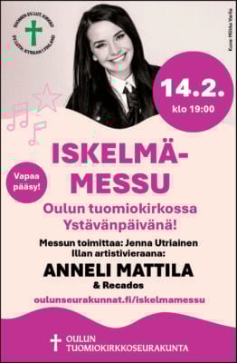 Kaiken kansan viikkomessu to 24.2. klo 13 Tyrnävän kirkko. Matias Muhola, Piritta Aatsinki, Salme Kinnunen.