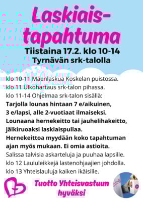 Laskiaistapahtuma Yhteisvastuun hyväksi su 15.2. klo 12–15 srk-keskuksessa. Tervetuloa nauttimaan mukavasta päivästä hoijakan, mäenlaskun ja muun ohjelman ohessa. Myynnissä kahvia, teetä, mehua, makkaraa, hernekeittoa, laskiaispullia. Maksu käteisellä tai mobilepaylla.