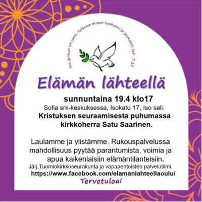 Sanajumalanpalvelus su 19.4. klo 10 kirkossa. Toimittaa Seija Helomaa, kanttorina Väinö Ylimäki.